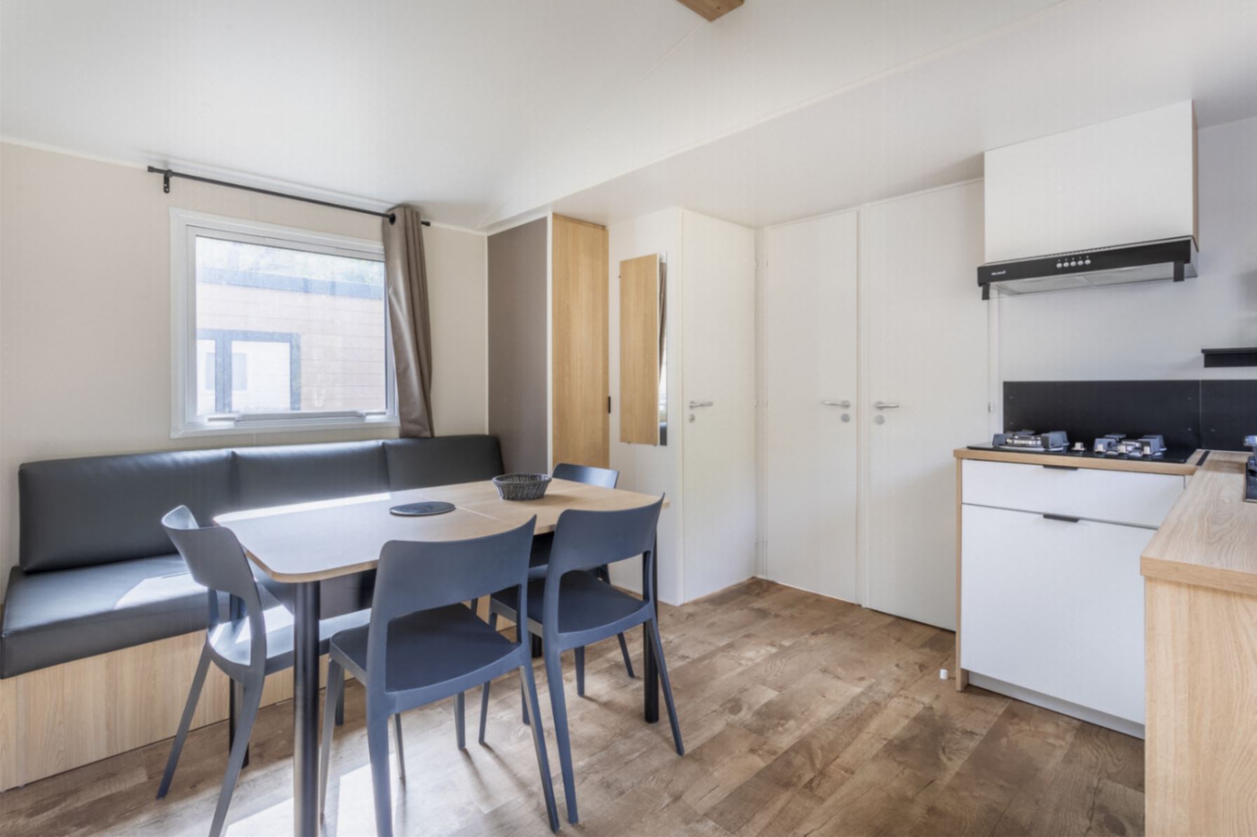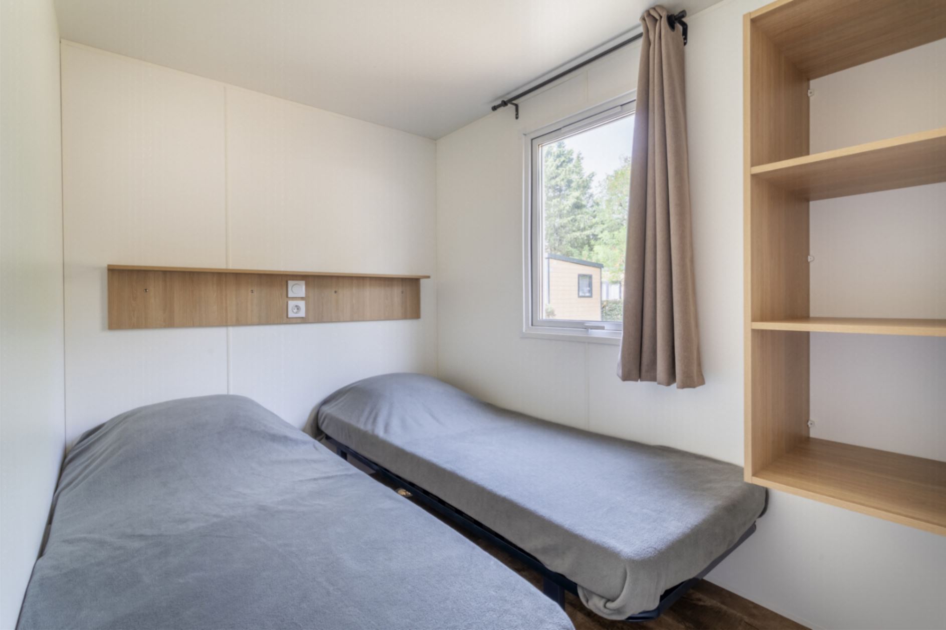 Sleeping area: one bedroom with 1 double bed (140X190) and two bedrooms with two single beds (80) side by side, pillows and blankets provided.
