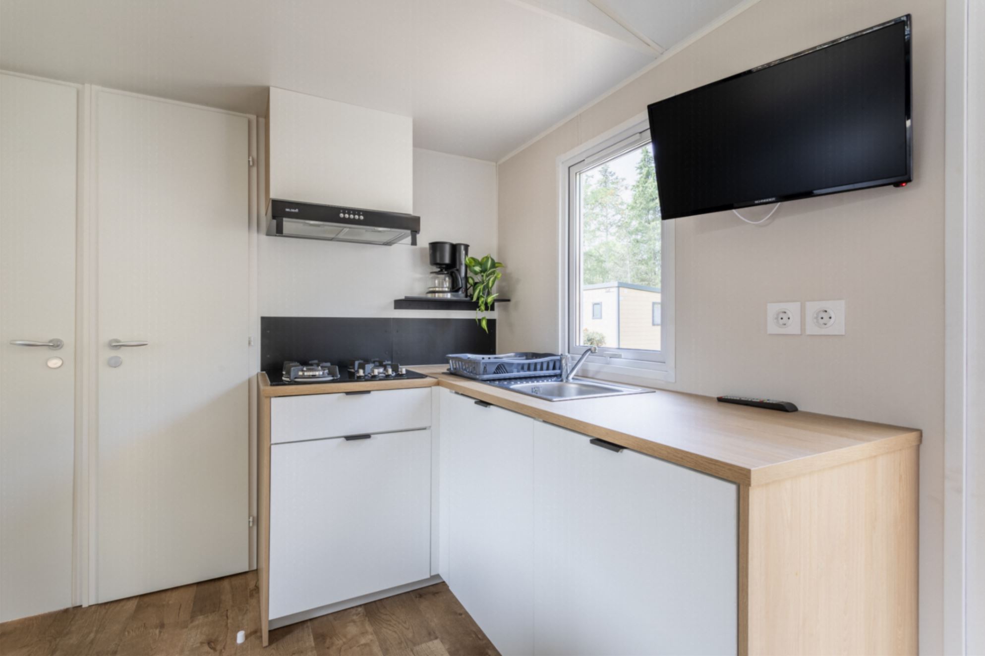 Living room/kitchen area: equipped kitchen (sink, gas, fridge-freezer, coffee maker, microwave, dishes), heating in the living room, air conditioning, TV.