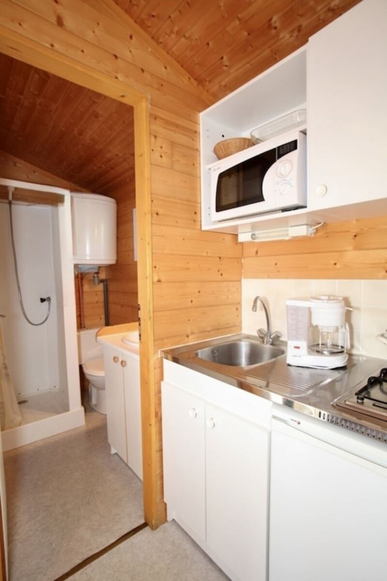 Coin salon/cuisine : cuisine équipée (évier, cuisinière à gaz , réfrigérateur (table top 100 litres), cafetière à filtre, micro onde, vaisselle).