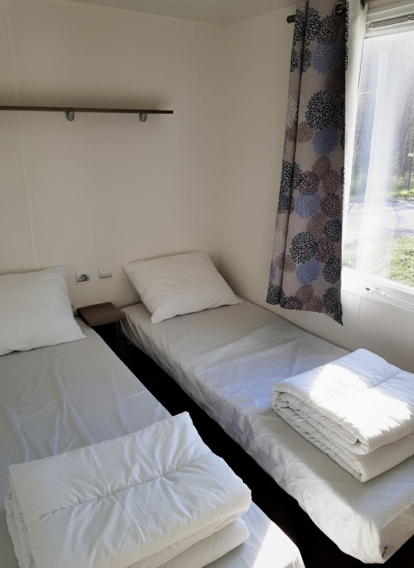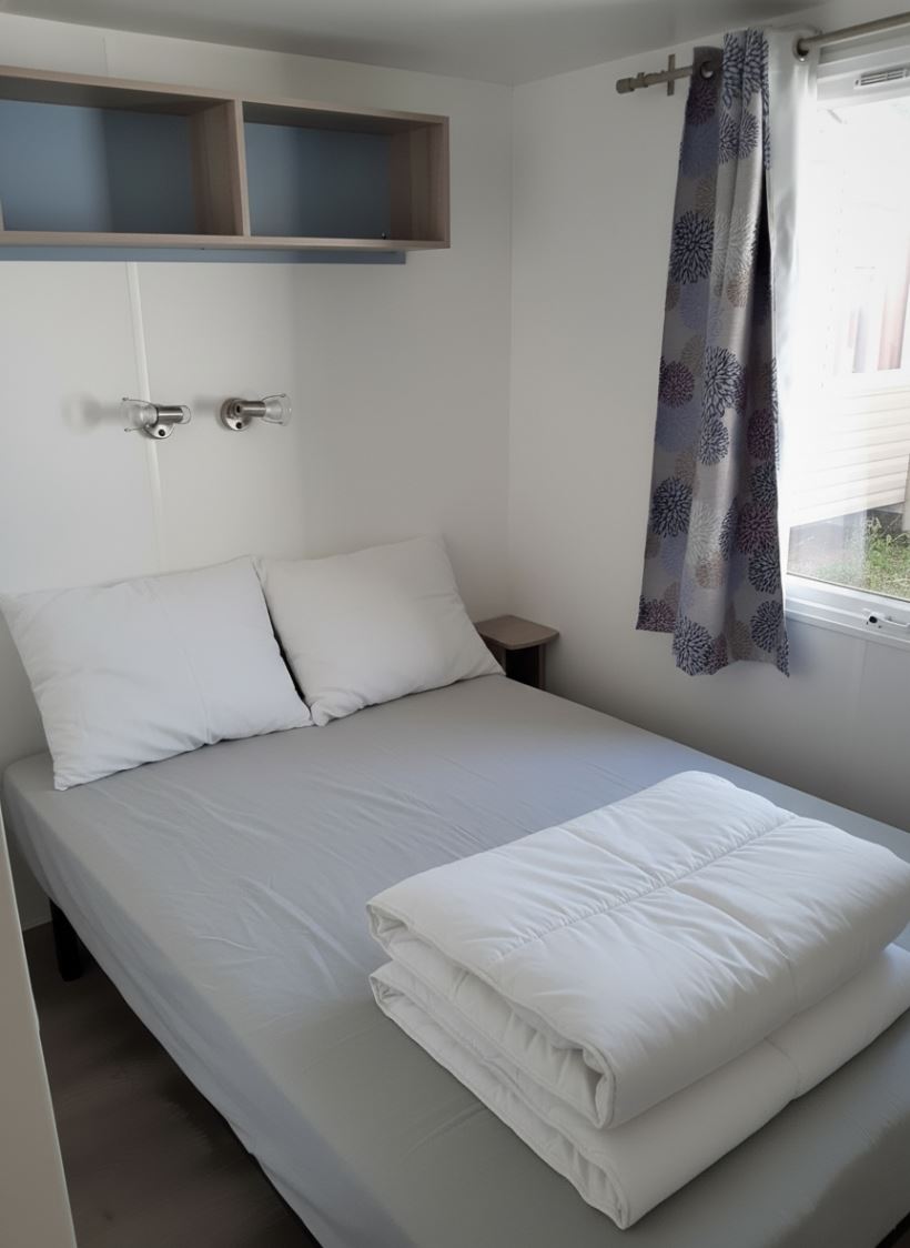 Coin nuit : une chambre avec 1 lit double (140X190), deux chambres avec 2 lits simples (80×190) côte à côte, oreillers et couettes fournis.