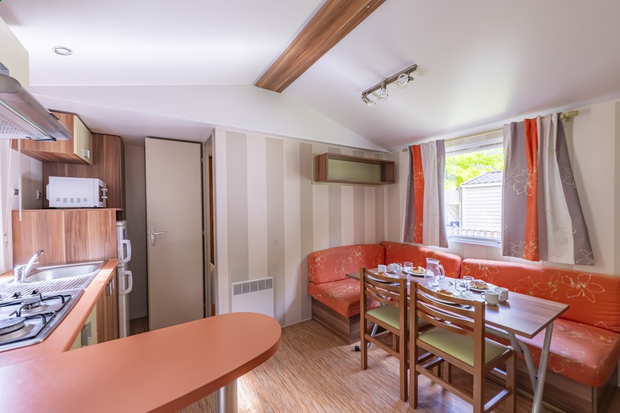 Coin salon/cuisine : cuisine équipée (évier, feux gaz, réfrigérateur-congélateur, cafetière à filtre, micro-ondes, vaisselle), radiateur dans le séjour et climatisation.