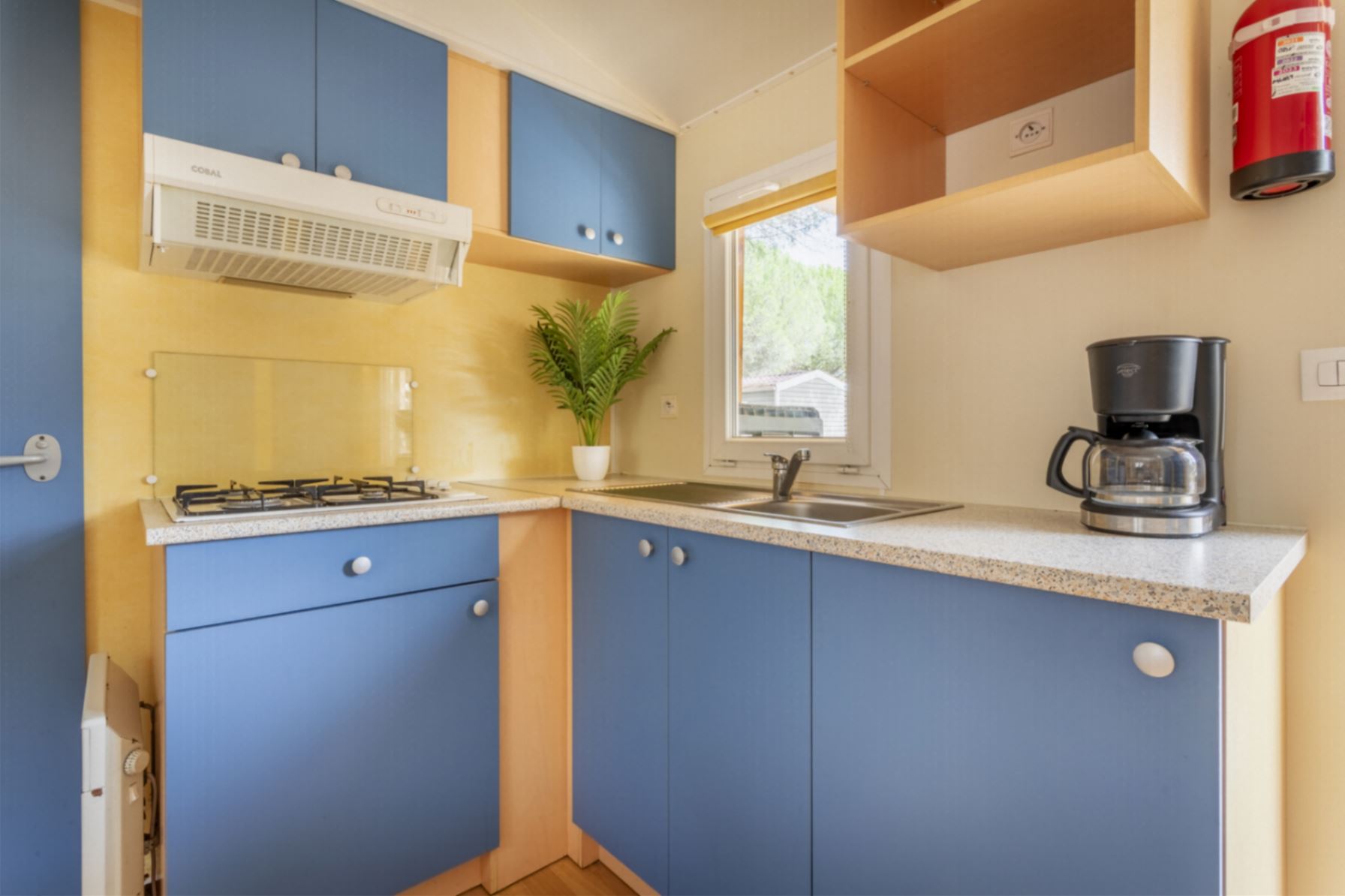 Coin salon/cuisine : cuisine équipée (évier, feux gaz, réfrigérateur, cafetière, micro-onde, vaisselle), chauffage dans le séjour.