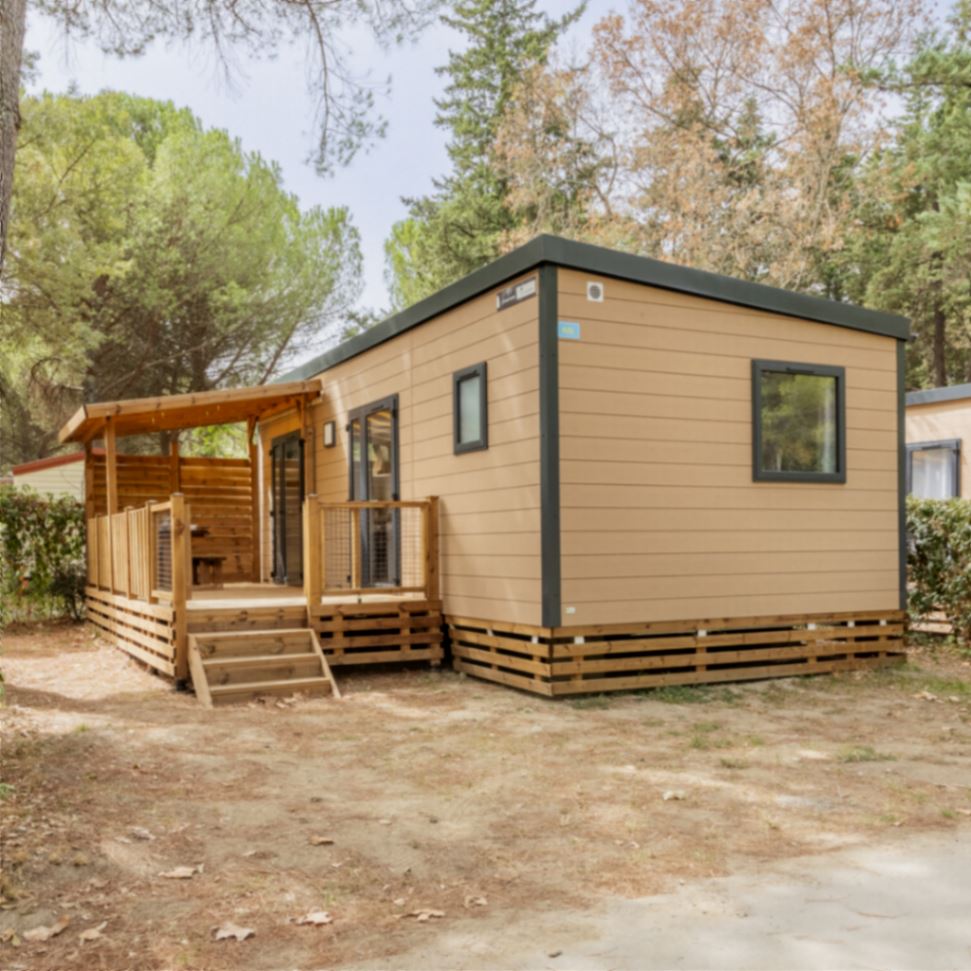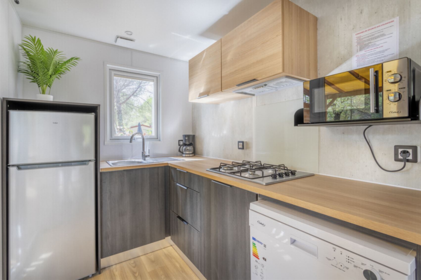 Coin salon/cuisine : cuisine équipée (évier, gaz, réfrigérateur-congélateur, cafetière, micro-onde, vaisselle, lave-vaisselle), radiateur dans le salon, climatisation, TV.