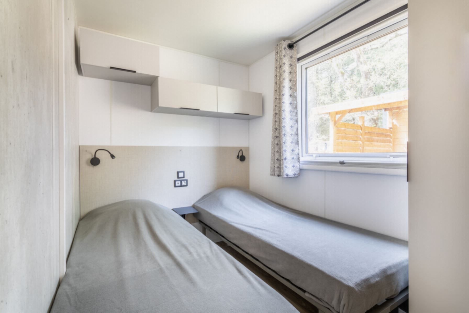 Coin nuit : une chambre avec 1 lit double (160×200) et une chambre avec deux lits simples (80×190) côte à côte, oreillers et couvertures fournis.